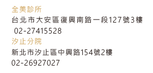 全美診所 單點治療 多點服務 Tel:大安:02-27415528 中山:02-25213055 內湖:02-2658-5528 汐止:02-26927027 | 大安:台北市復興南路一段127號3樓,中山:台北市中山區長春路152號1、2樓,內湖:台北市內湖路一段360巷2-1號1樓,汐止:新北市汐止區中興路154號2樓