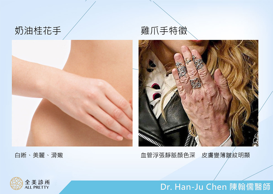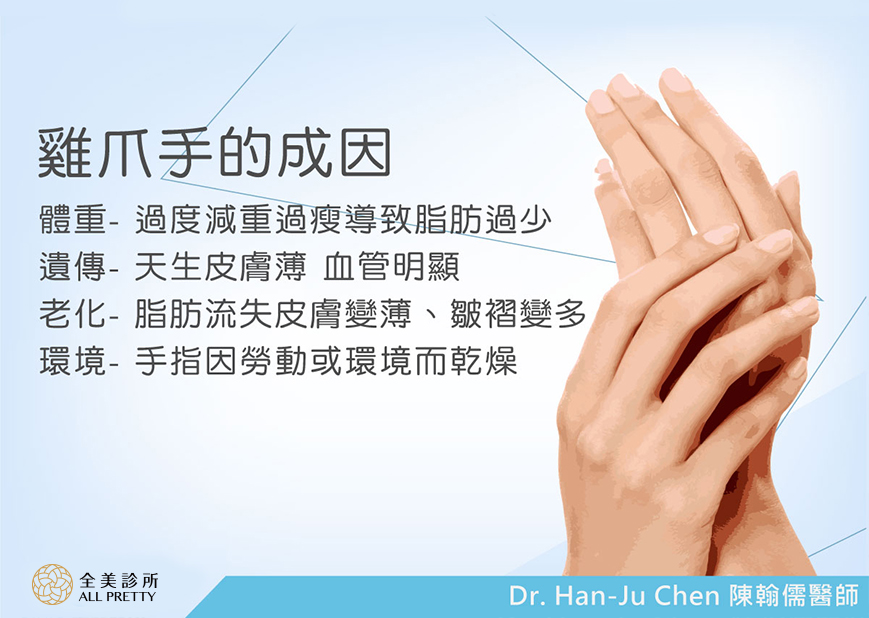 雞爪手成行原因有很多,像是手部過度用力、遺傳薄皮膚粗血管、接觸清潔劑時間過長、過度減重,疾病,其中老化是每個人無可避免的,我們能做的就是保護雙手並且做填充治療。