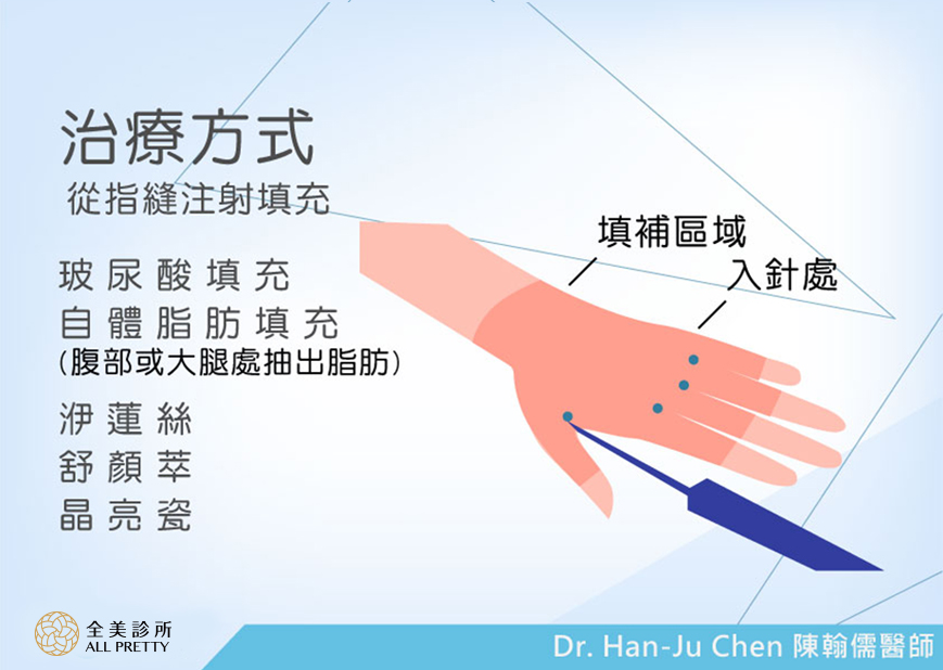 以虎口縫作為下針部位注射,因為手部皮膚較薄,所以需要按摩擴散填充物並讓它充滿皮膚手背底層達到豐盈效果。依照注射劑不同在注射後1星期-3個月內逐漸會感覺到凹陷獲得改善。