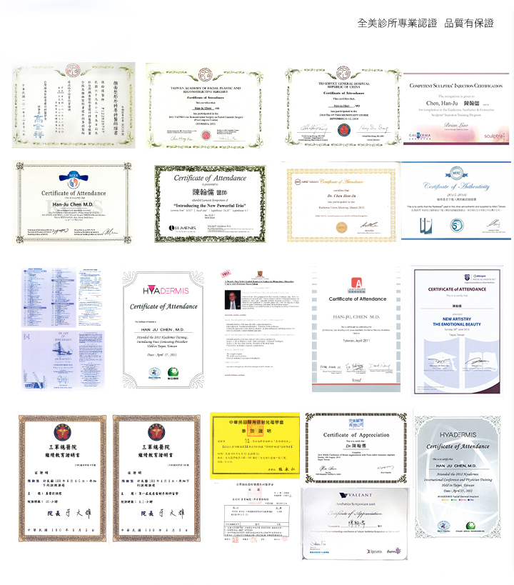 全美診所陳翰儒醫師接受國際原廠訓練並取得專業認證證書,是您值得信賴的安心醫美。