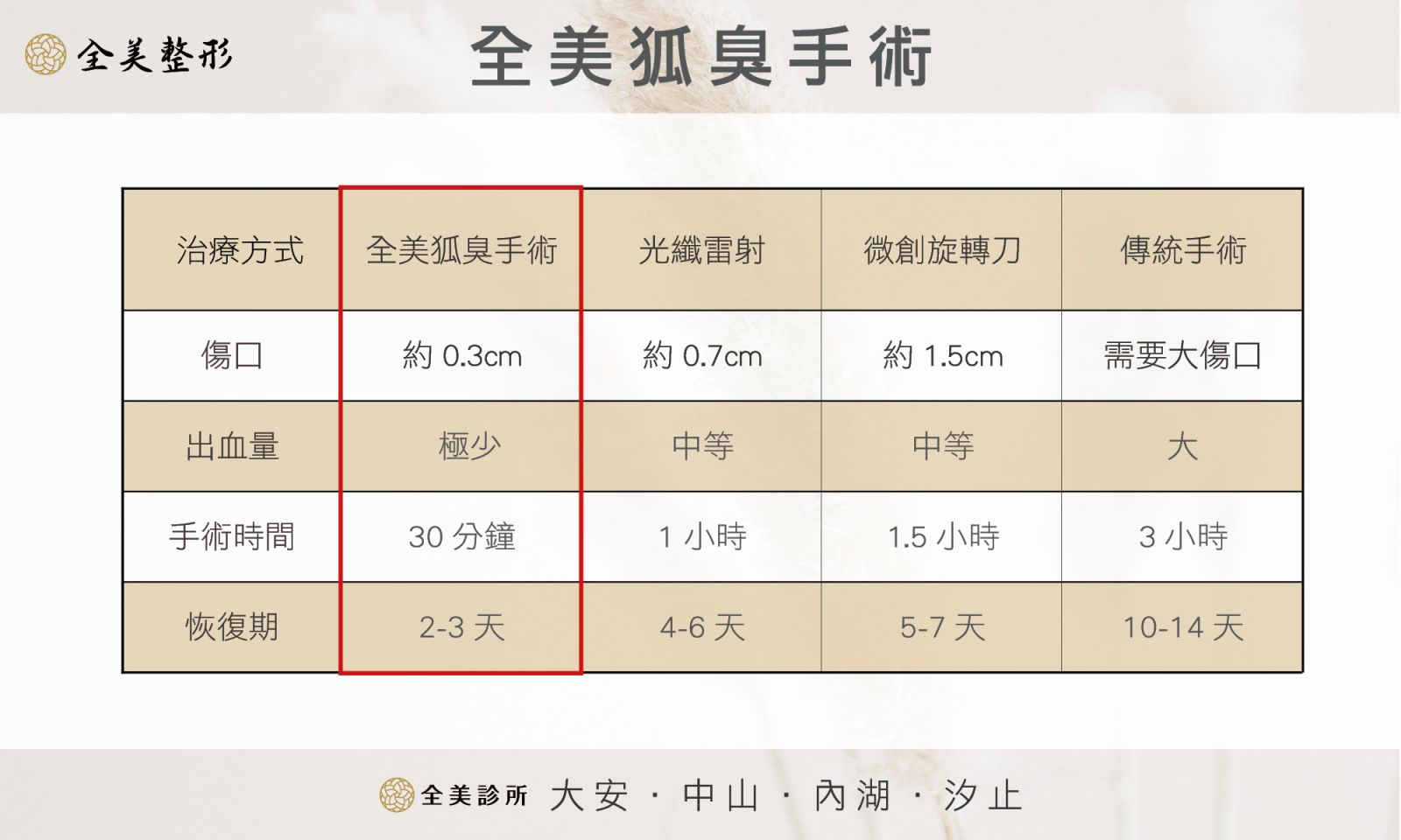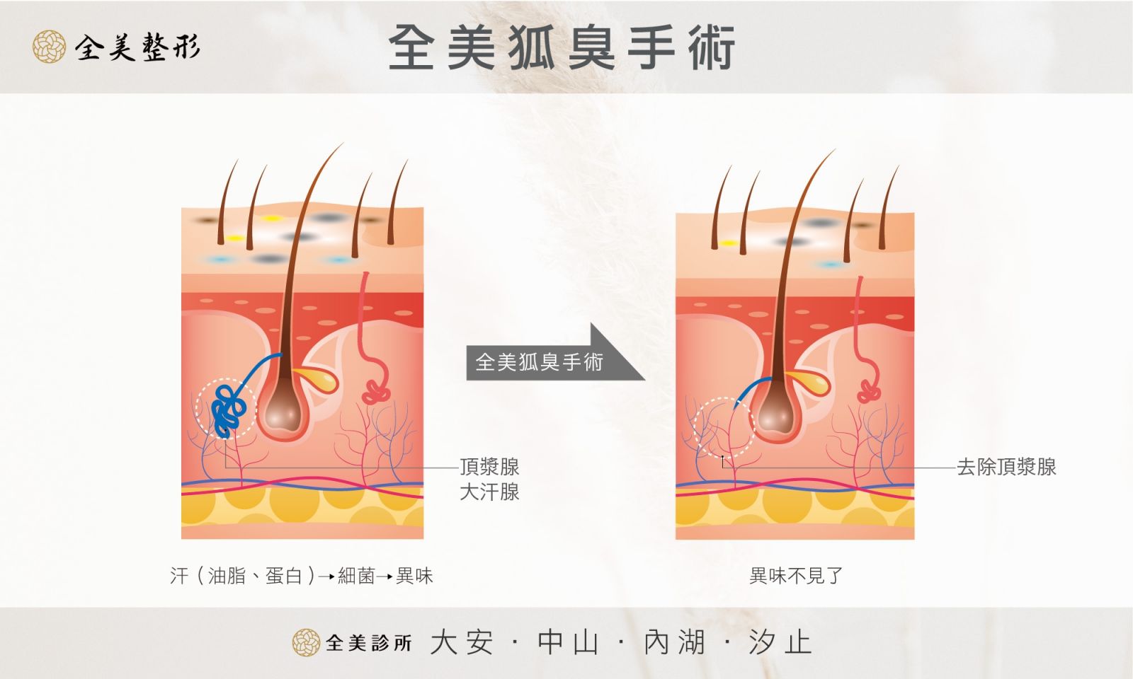 手術類的療程「全美狐臭手術」,是透過腋下0.3cm小孔將頂漿腺體去除,術後消腫快、恢復期短、術後當天即可上班。