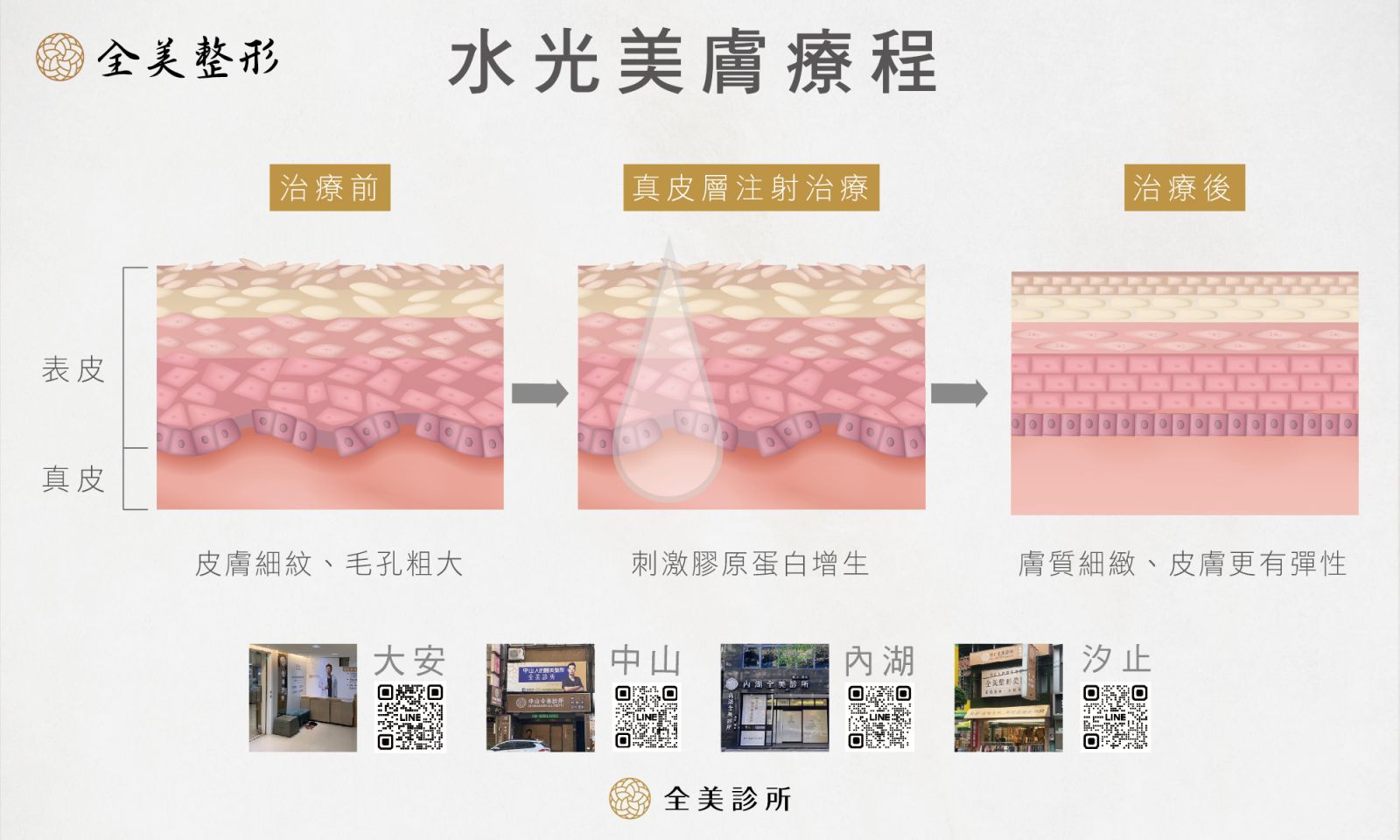 「水光美膚療程」可精準均勻注射肌膚的真皮層,不僅為肌膚提供了深層保濕,更能有效淡化細紋、暗沉和毛孔粗糙等。