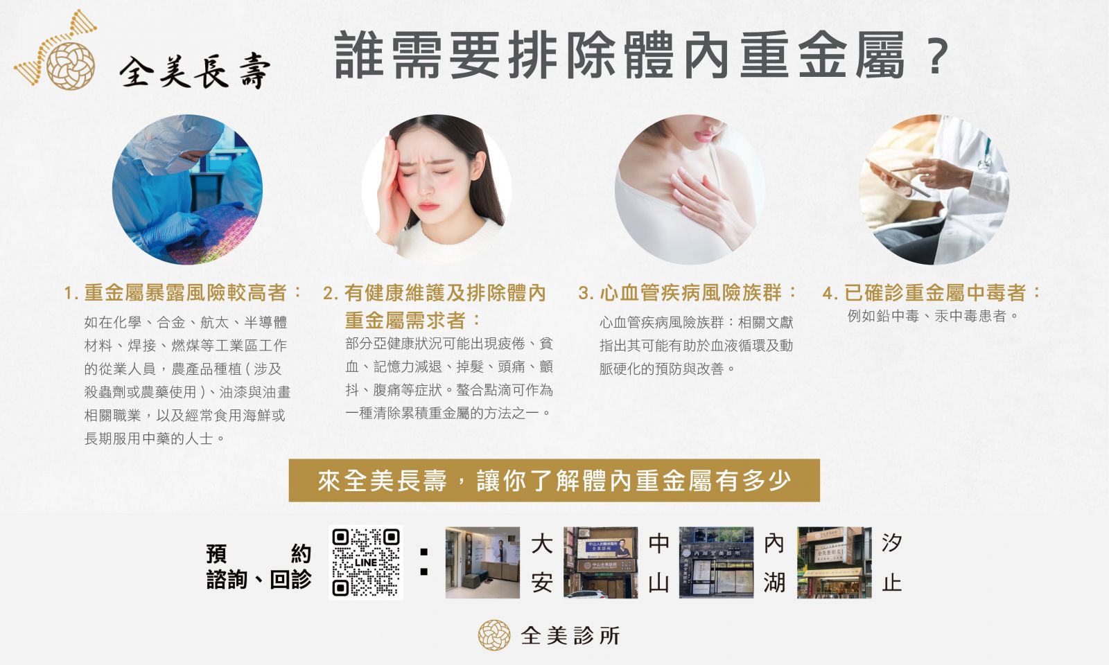 全美長壽的雙排療程是在排除重金屬(如螯合療法)與排除塑化劑。螯合療法利用靜脈注射EDTA,將體內有害重金屬轉化為可排出的無毒物質,以降低體內重金屬濃度並促進血液循環。此治療方式能有效去除鉛等金屬,但效果速度因人而異,建議採漸進式療程。