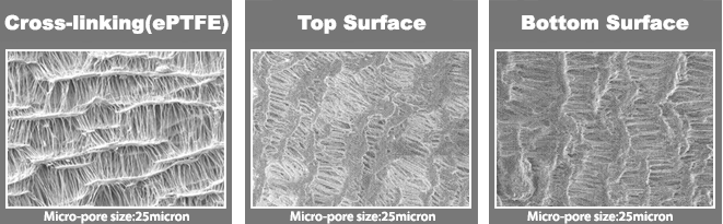 Goretex聚四氟乙烯(PTFE)原先應用於重建、人工血管和心臟中膈缺損修補等手術,材質柔軟表面佈滿20到40 um大小的孔洞 每平方英吋有高達90億個細小孔,可以讓組織長入,使假體術後生物相容性更好、不位移、降低夾膜攣縮,