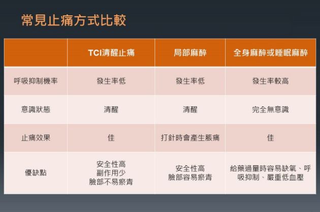 陳翰儒醫師指出若是擔心風險又想有效止痛其實還有一個選擇:全美診所為TCl清醒止痛台灣區教育訓練診所,以靜脈注射方式,透過高科技電腦程式,依照患者的年齡、體重、身高、性別等數據,客製化精準給予安全且足量的止痛藥劑。透過TCI儀器呈現藥劑在血中的濃度,醫師可以比較精準的控制麻醉深度,讓接受手術的顧客在過程中達到鎮靜止痛的最好效果,又能同時在有需要時聽從醫師的指令,協助醫生提高手術的精準性和穩定性。