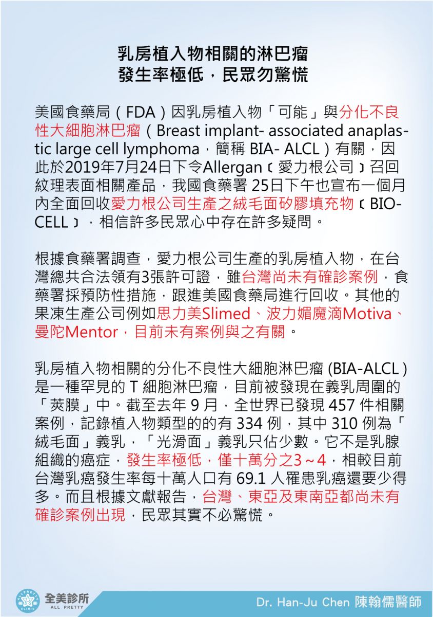 乳房植入物相關的淋巴瘤發生率極低,民眾勿驚慌