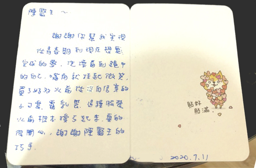 休息個一兩天就慢慢地適應那沉甸甸的胸部。現在的我,不僅可以撐起每件衣服,每每看鏡子,真的讓人莫名的開心。謝謝陳醫師,真的找回了我的自信。