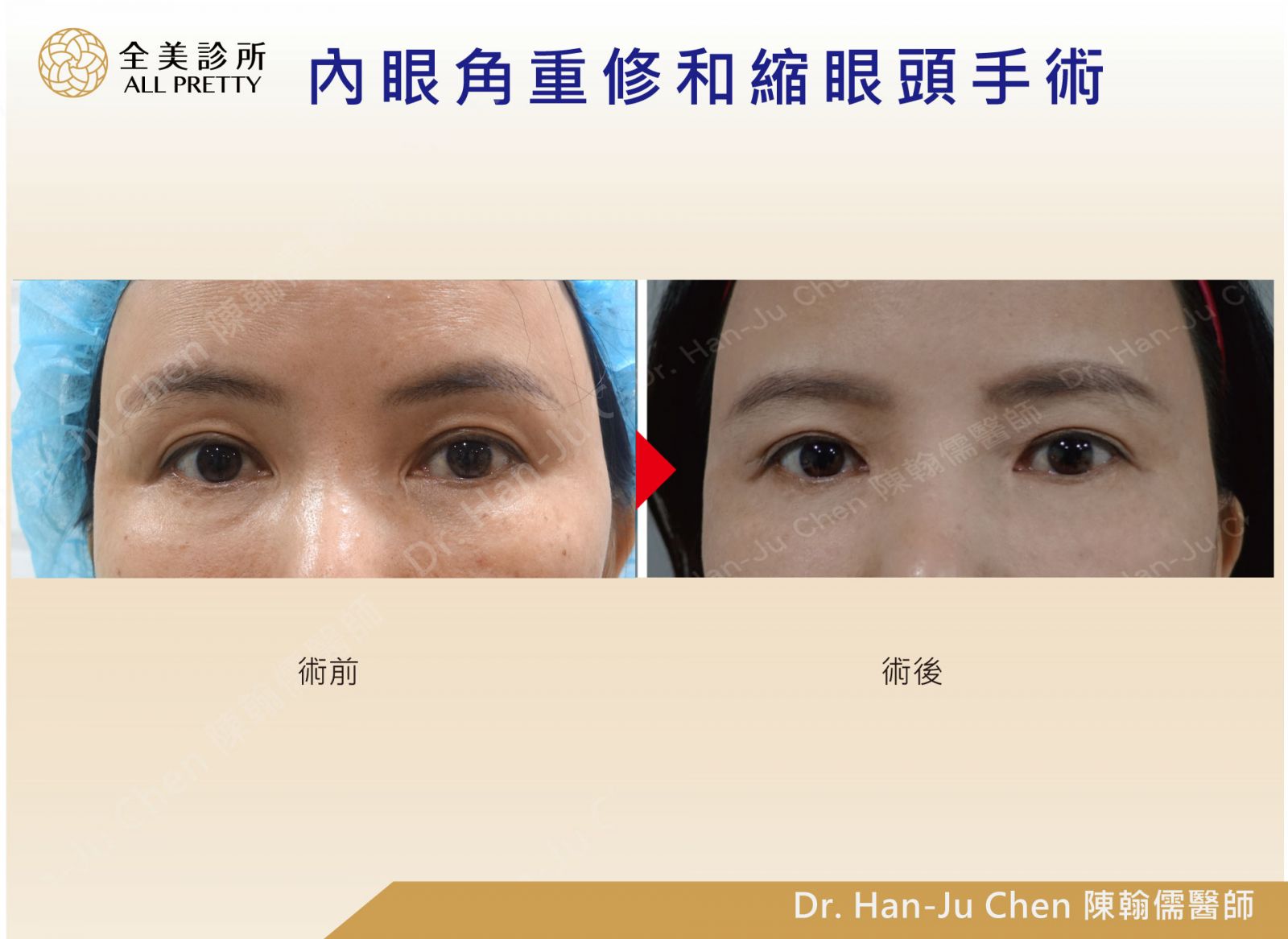 以下這位女性患者則是在院外因為其他的開眼頭手術方式造成疤痕明顯,與眼頭打太開的情況,在我們「全美診所陳翰儒總院長」諮詢建議下,施行了「內眼角重修和縮眼頭手術」。利用「皮瓣反轉置」的原理,將原本明顯的術後疤痕隱藏起來,且將眼頭修復為自然而有效果的比例。