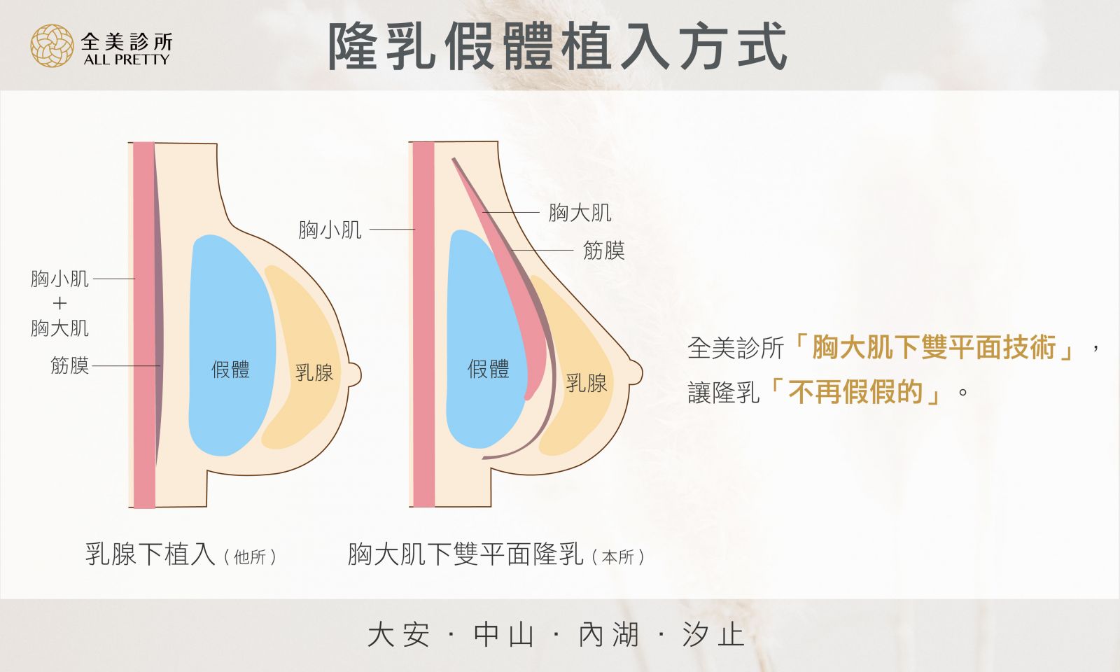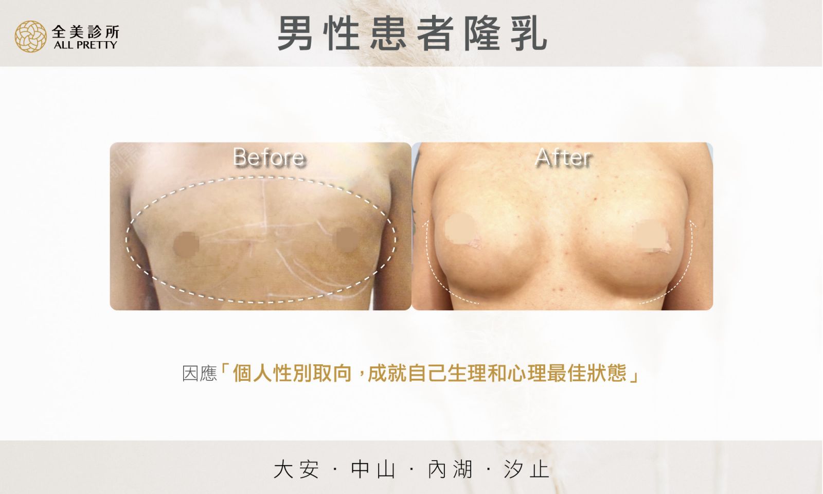 在隆乳手術層面的選擇上,全美診所採用「胸大肌下雙平面隆乳術」,增加假體表面覆蓋的軟組織厚度,以避免「男性皮膚緊繃可能出現的球感」。