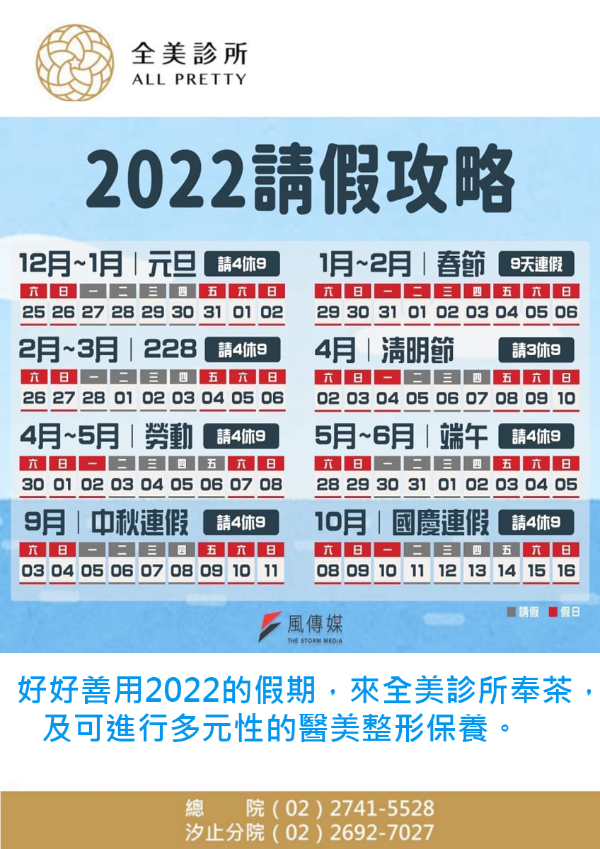 2022年 善用連假假期,提早預約讓自己悄悄變美。