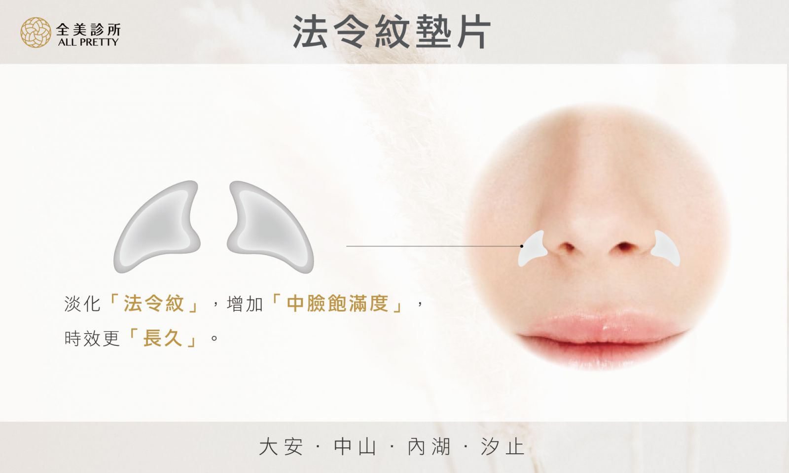 此個案年輕女性患者希望以維持時間較持久的方式來改善法令紋,其法令紋型態屬「凹陷型」,因此全美診所的陳翰儒總院長,依患者醫療需求,給予的療程處置建議是施行「法令紋墊片及自體脂肪填補」的雙效療程”。