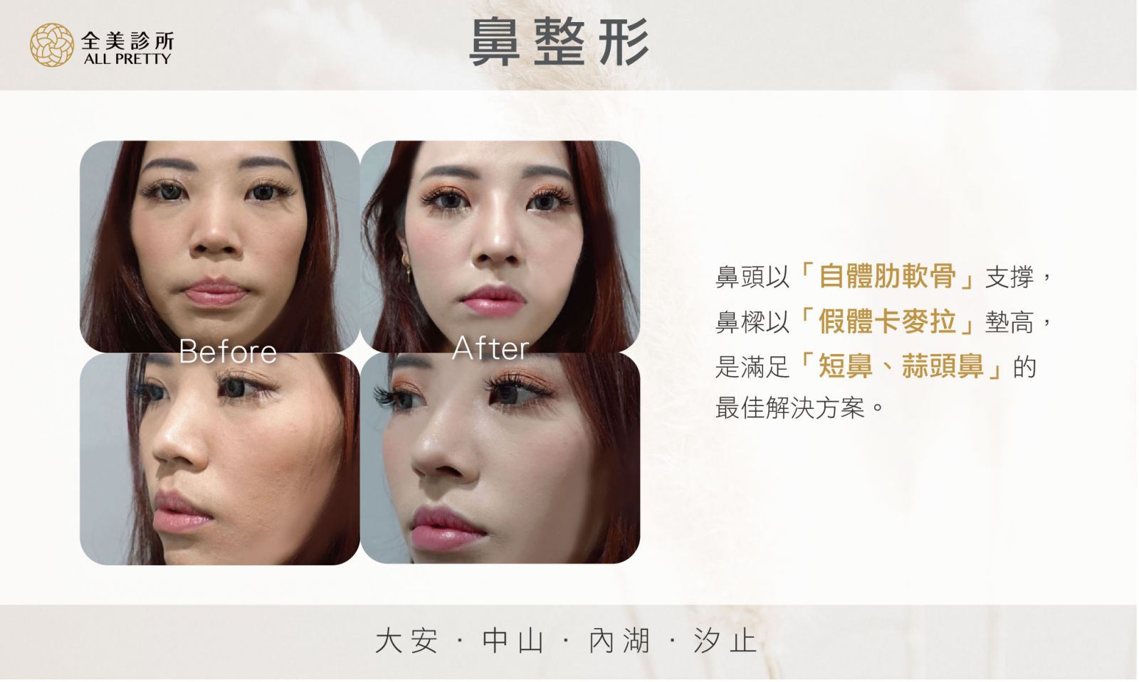 「全自體肋軟骨鼻頭整形」是「全美診所三大核心專業整形手術」之一,是由「台灣顏面整形重建外科醫學會理事」陳翰儒總院長親自操刀,有15年以上鼻整形手術歷程,以「自體肋軟骨」當鼻頭整形的材質,搭配「鼻中隔延長」技術,可以滿足鼻頭延長、更高挺度的需求,而肋軟骨支撐力好,遠期術後有高穩定度的效果,是「短鼻、蒜頭鼻、朝天鼻」的最佳解決方案。