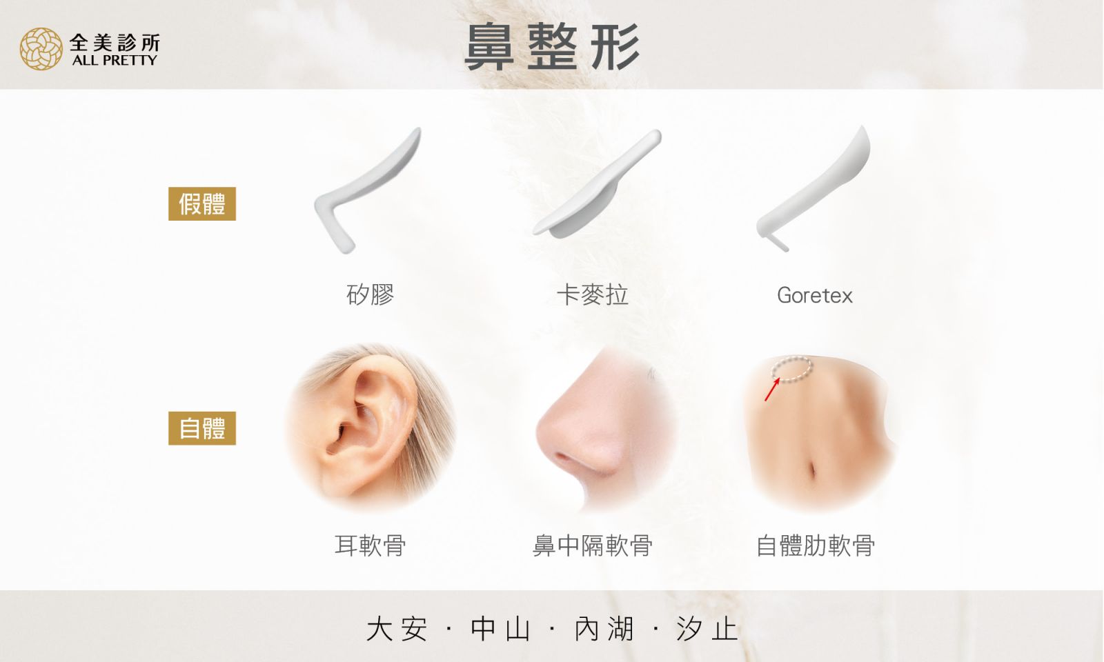 鼻樑「隆鼻」在初次手術的患者,首選會是「假體」,可以滿足術後鼻樑立體精緻與高穩定度的需求,材質可以是:Gortex、Gortex+矽膠、矽膠。