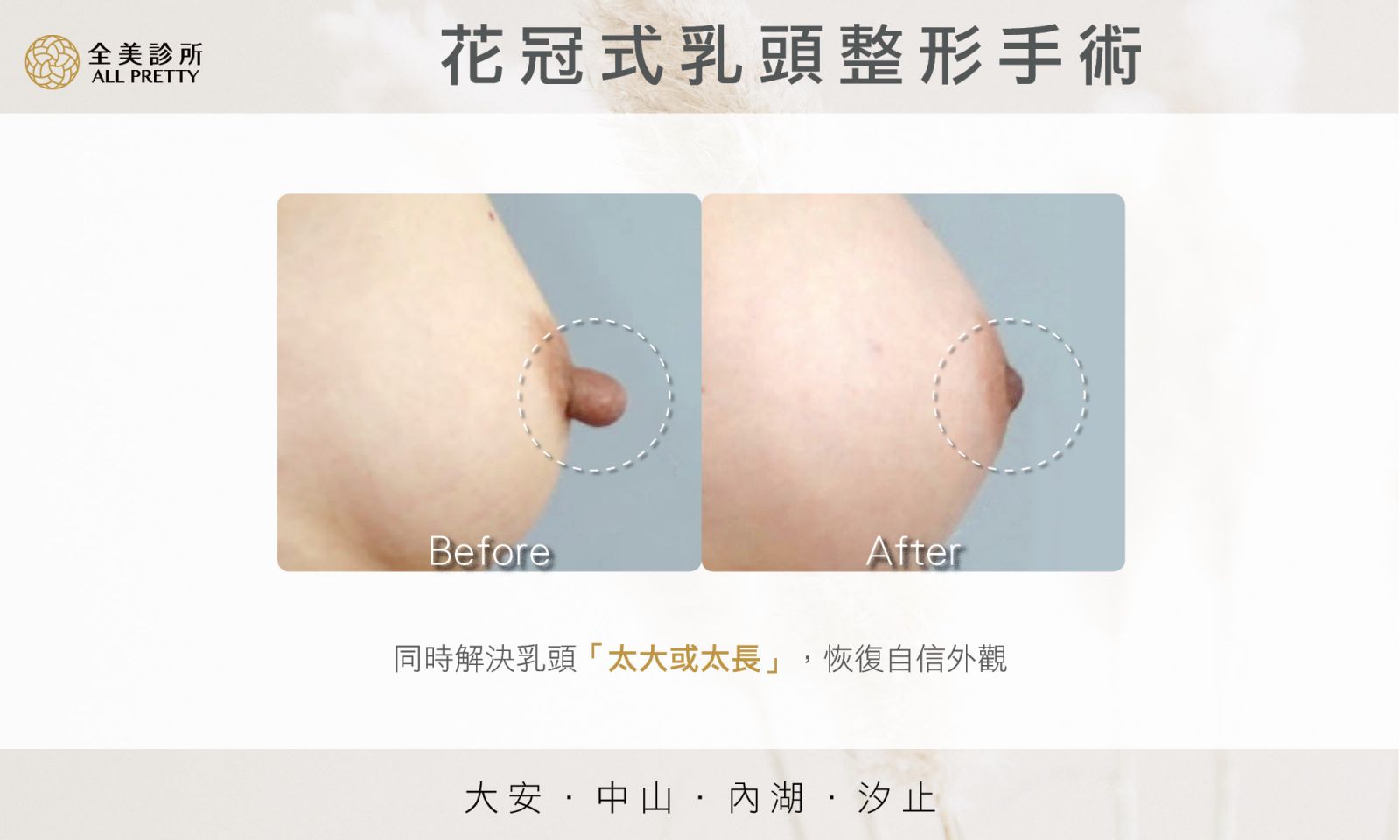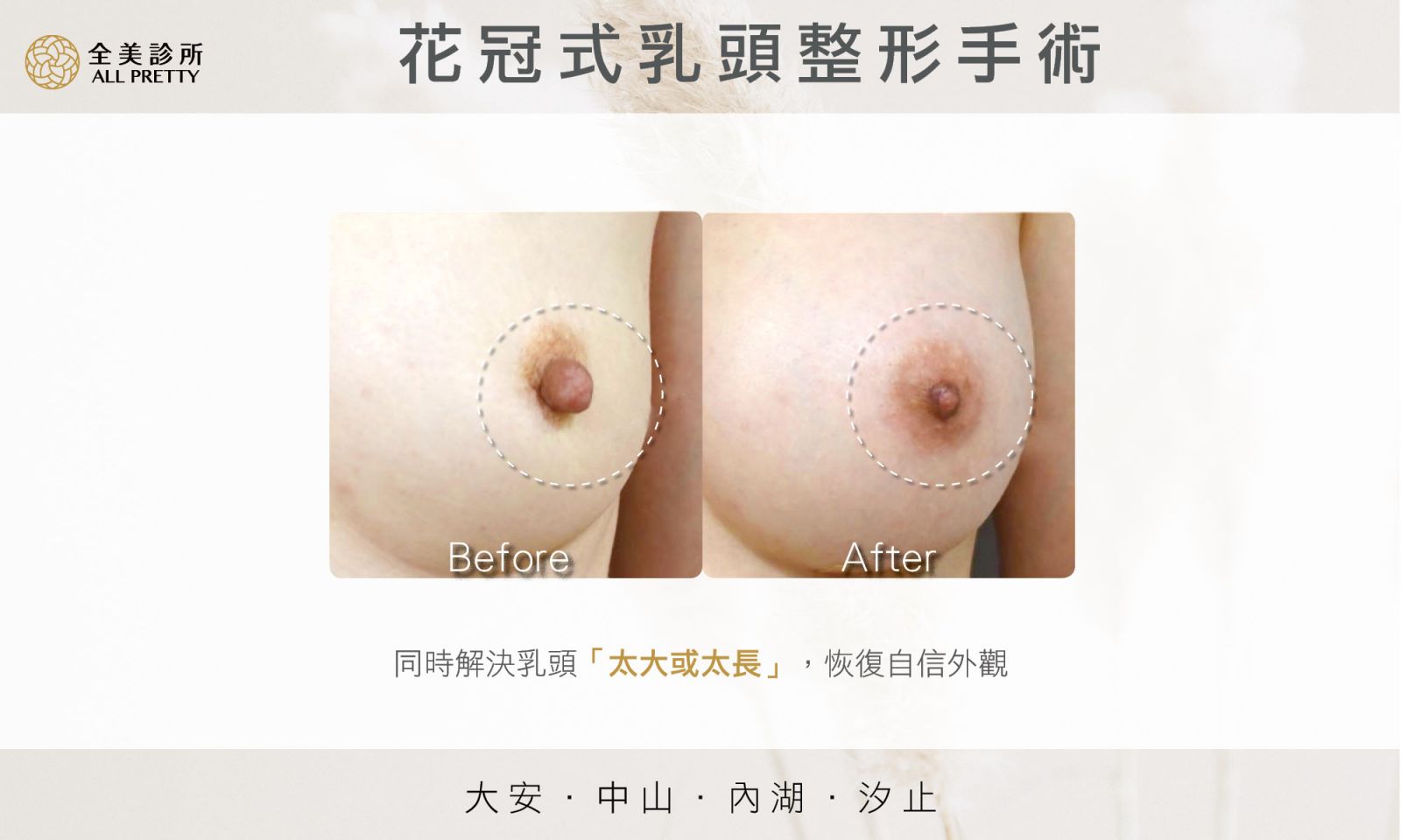 此女性患者有上述困擾,在「台灣亞太美容外醫學會」理事的陳翰儒醫師(全美診所總院長)依患者醫療需求,給予的醫療處置建議方案為:施行「果凍矽膠隆乳」與「花冠式乳頭整形」合併手術,來滿足患者「女為悅己者容」的需求。