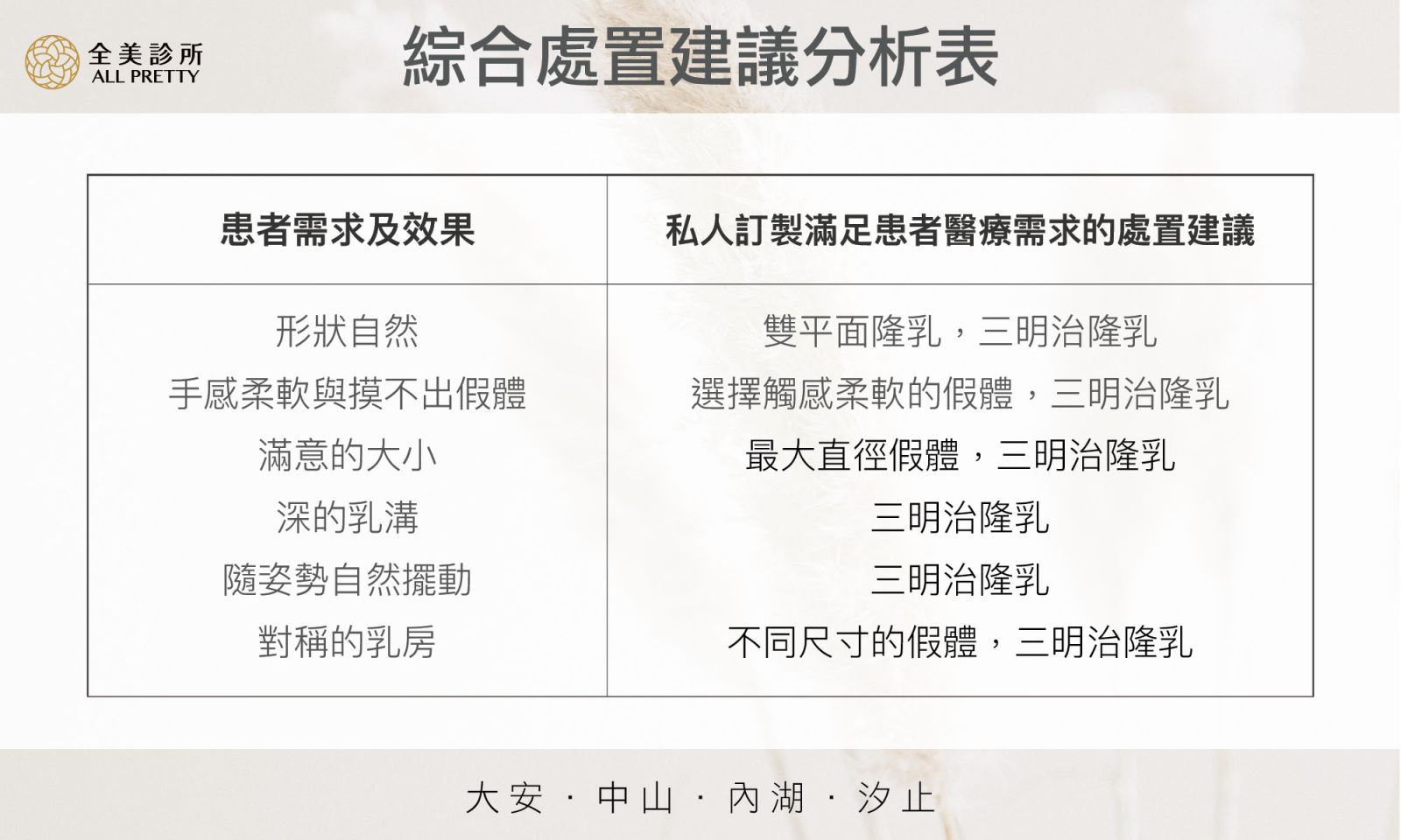 此女性患者的需求是一次手術可讓胸部「升級兩個罩杯以上」,同時兼顧形狀自然,全美診所採用「胸大肌下雙平面隆乳術」,有效避免術後皮膚緊繃的邊緣感。並採用「乳下緣切口」來滿足患者「恢復快速、安全性高」的需求。